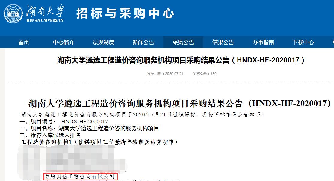 恭賀本公司中標(biāo)湖南大學(xué)工程造價(jià)咨詢服務(wù)機(jī)構(gòu)庫