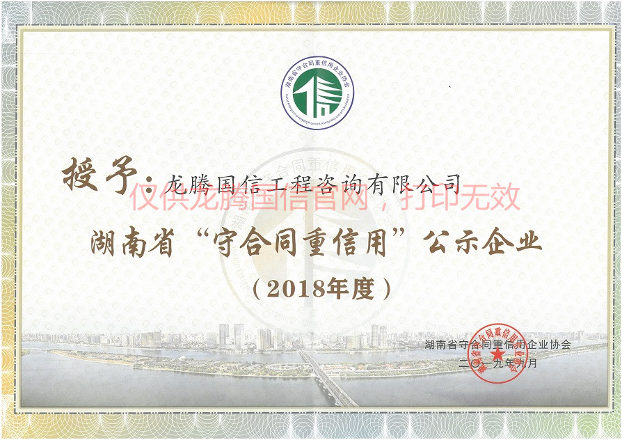恭賀我公司榮獲湖南省2018年度守合同重信用單位榮譽
